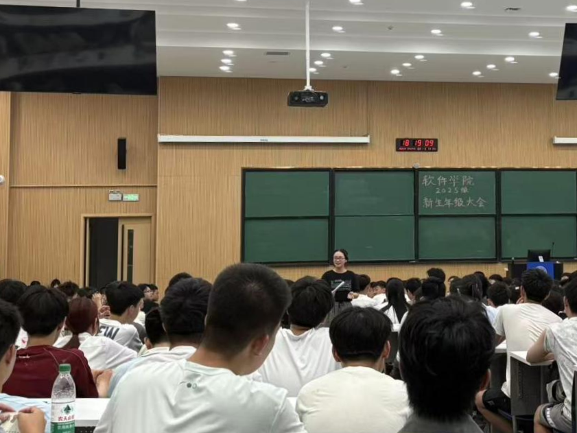 为帮助新生更好的熟悉校园环境、适应大学节奏,顺利完成角色转换,8月24日,软件学院于敬信教学楼第一阶梯教室召开2025级本科新生第一次年级大会,辅导员戴嘉宜担任主讲人,围绕大学生涯规划、专业特点、大中衔接、行为规范、生活安全等核心内容,为新生们带来一场兼具指导性与实用性的入学教育。