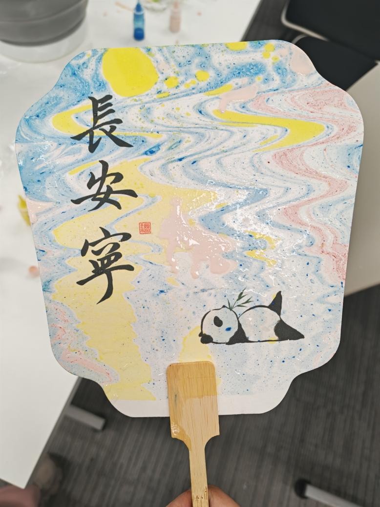 讲解结束后,学生们领取工具材料开启创作。现场氛围热烈,大家发挥想象与创造力,在素扇上挥洒灵感,水面画液经扇面承载化作灵动图案,有的如麦田浪花,有的似蓝天星光,彰显巧思。学生们交流技巧、分享心得,在实践中感受漆艺与扇文化的融合,体会东方美学的雅致。漆扇兼具实用与观赏性,既是收藏艺术品,也是传情佳品,让传统之美融入现代生活。
